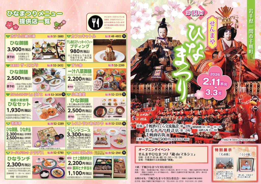 せんまやひなまつり開催期間に千厩町内の飲食店でひなまつりメニューが食べられます。 それぞれの提供店がひなまつりにちなんだ限定料理を提供します。 お食事でもせんまやひなまつりをお楽しみください。